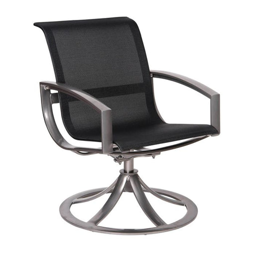 WoodardAluminum Metropolis Sling Swivel Dining Armchair by Woodard Outdoor Furniture. Height: 34.5"; Width: 25.25"; Depth: 29.25"; Seat Height: 18"; Arm H...