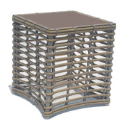 he Ruby End Table adds a stylish, airy touch to any outdoor setting. Its durable aluminum frame in a silver walnut finish is wrapped in handwoven Ecolene Kubu Mushroom synthetic fibers for a unique open-weave design. The tempered glass top offers a smooth, functional surface, making it a perfect accent piece for patios and lounges.