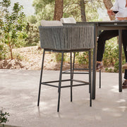 A captivating piece that effortlessly transforms any outdoor space into a stylish haven. Its broad backrests lend an intimate and unparalleled charm. The barstool features a powder-coated aluminum frame and a light gray polystrand strap rope. A comfortable cushion is included in 5453 Sunbrella Canvas or you can choose from other available Sunbrella options. Crafted for durability, the chair combines modern elegance with resistance against the elements. Create a personalized outdoor oasis with the Boston Outdoor Barstool, where style, comfort, and durability converge.