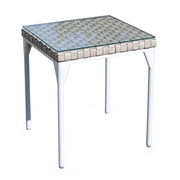 The Brafta Side Table is a sleek and durable accent piece for outdoor lounging areas. It features a white aluminum frame, woven with Ecolene Seashell flat fiber, and finished with a tempered glass top for a modern, refined look.