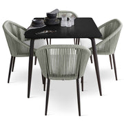 Effortlessly stylish and made for modern outdoor living, the Rodona 5-Piece Square Dining Set brings a sculptural feel to any space. Featuring four curved rope-wrapped dining chairs and a compact square table, this set is perfect for patios, balconies, or boutique hospitality settings. Sunbrella cushions add comfort and durability, rain or shine.