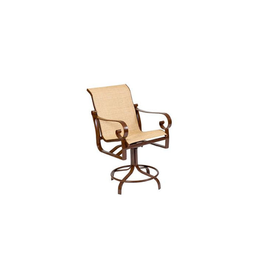 WoodardAluminum Belden Sling Swivel Counter Stool by Woodard Outdoor Furniture. Height: 42.5"; Width: 25.25"; Depth: 30.75"; Seat Height: 24.75"; Arm Heig...