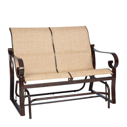 WoodardAluminum Belden Sling Glider by Woodard Outdoor Furniture. Height: 36.25"; Width: 46"; Depth: 33"; Seat Height: 18"; Arm Height: 25.25"