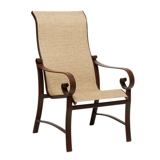 WoodardAluminum Belden Sling High-Back Dining Armchair by Woodard Outdoor Furniture. Height: 42.5"; Width: 25.25"; Depth: 31.6"; Seat Height: 17.5"; Arm H...