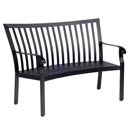 WoodardAluminum Cortland Cushion Crescent Shaped Bench by Woodard Outdoor Furniture. Height: 36.75"; Width: 56.5"; Depth: 30.25"; Seat Height: 17.5"; Arm ...