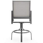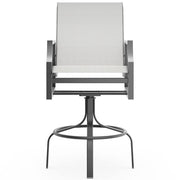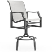 Aluminum Nico Sling Swivel Bar Stool by Woodard Outdoor Furniture. Height: 47.75"; Width: 25.25"; Depth: 30.5"; Seat Height: 30"; Arm Height: 36.75"